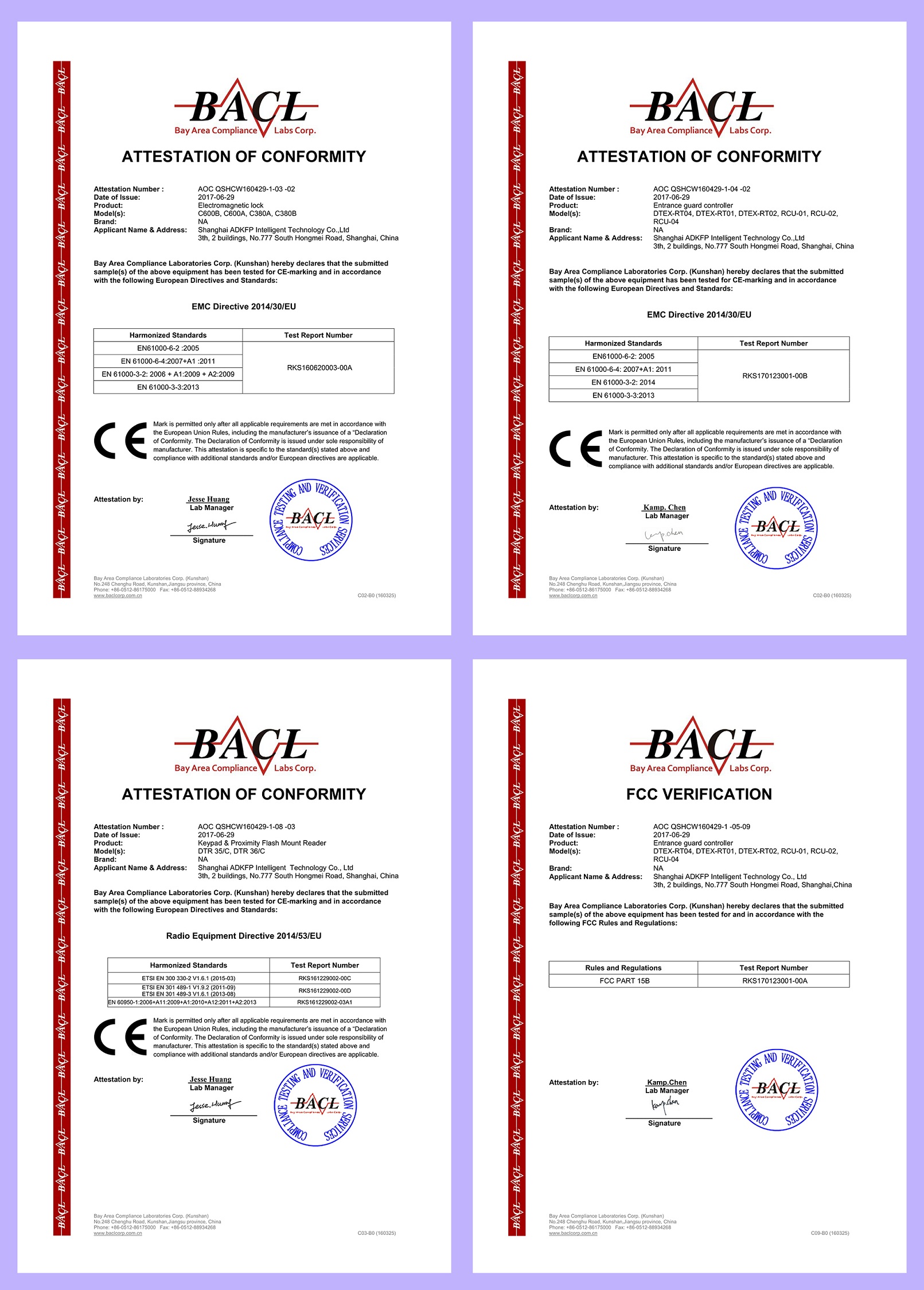 近日,費浦安防憑借優(yōu)異的產(chǎn)品性能和雄厚的科研力量,本公司的門禁控制器、讀卡器、電鎖等產(chǎn)品于2017年06月相繼通過FCC和CE認證,這是公司在科研創(chuàng)新道路上又一里程牌式事件。